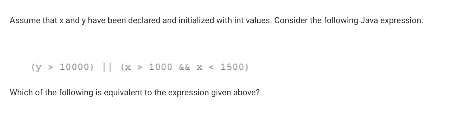 Explanation: The original expression evaluates to true when either y is greater than 10000 or x is between 1000 and 1500. If the value of y is greater than 10000, this equivalent expression will evaluate to true since it is used in both of the or (||) expressions. If y is not greater than 10000, the only way the equivalent expression can evaluate to true is if x is between 1000 and 1500.